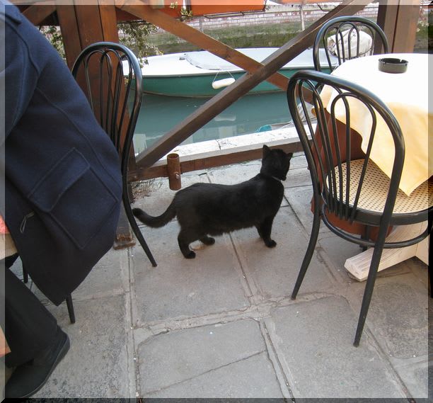 角地のレストランでお客さんにすり寄っているちょっと大きな猫。