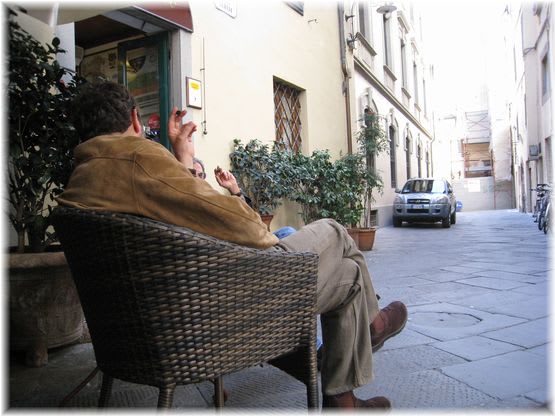 レストランの表ではおじさん二人がじっくり井戸端会議。