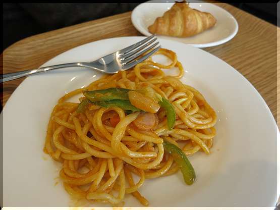 ろくに朝ごはんも食べてなかったので、おにぎりやら↓こちらのナポリタンには釘付け。