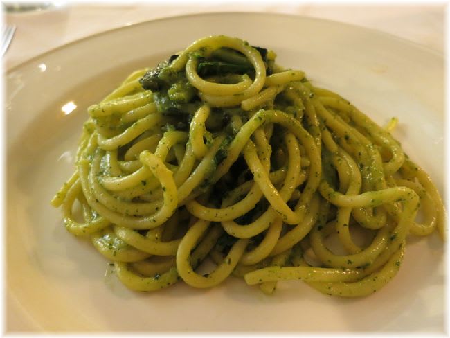 絡め方、パスタのもちもち感、ソースの青さが程よくてあっという間に完食。