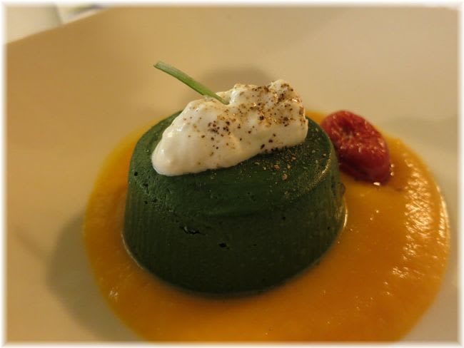 甘いかぼちゃソースに野菜(ほうれん草)のムース。