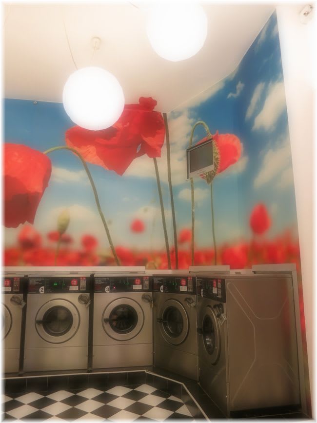 おしゃれな壁紙と照明が印象的なコインランドリー。