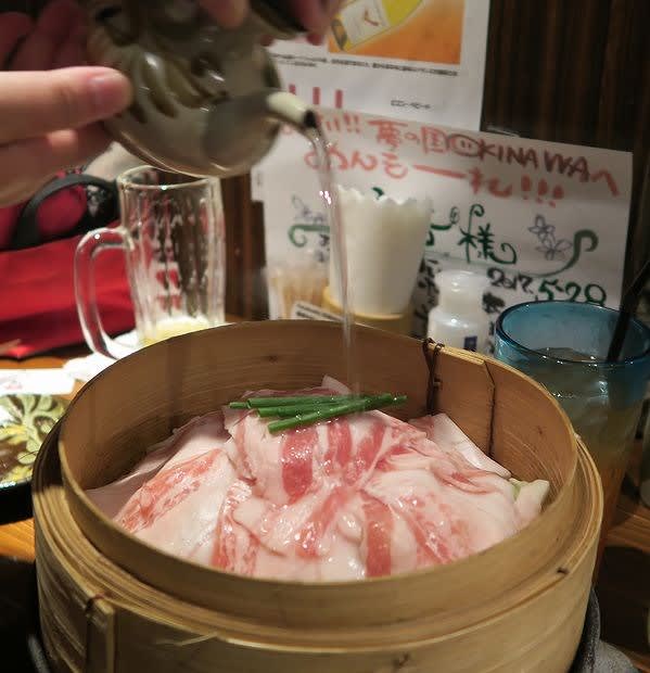 客自らが泡盛をたっぷりとかけ、熱せられた陶板のような鍋から蒸気がわんさか噴き上がる。