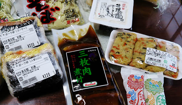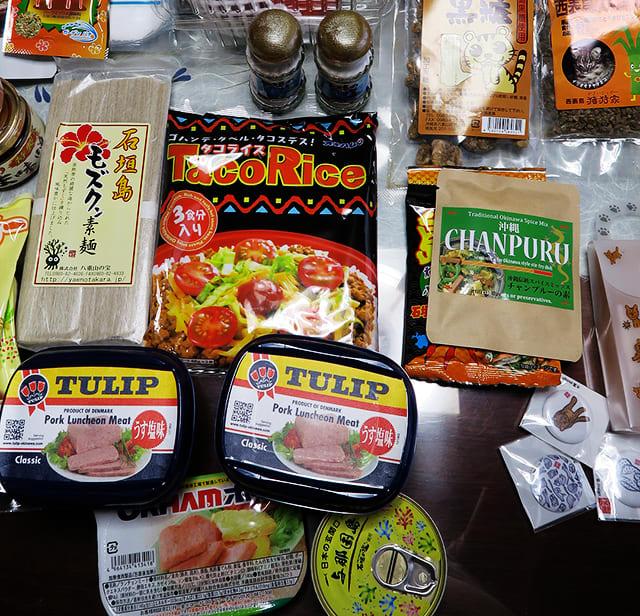 ポークランチョンミートも必須ですな。(与那国島のツナ缶も混じっているが)