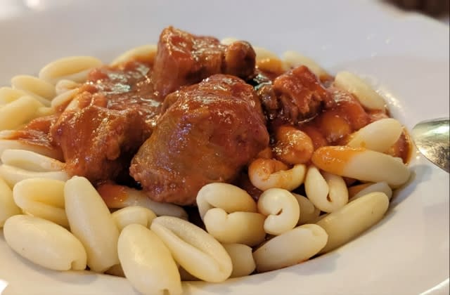 その土地の料理を食べたい主人は、豚肉のスネ肉が煮込まれたソースのパスタを選びます。