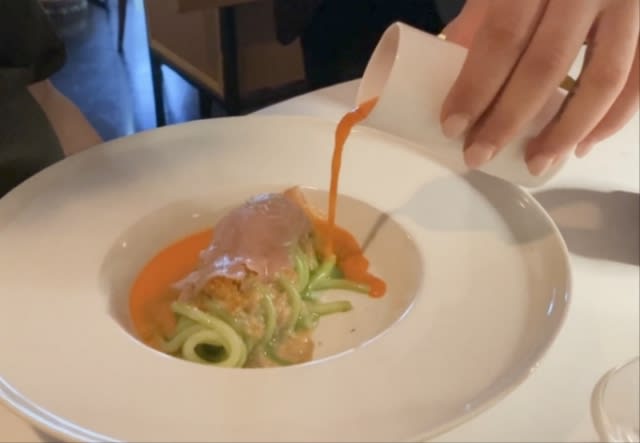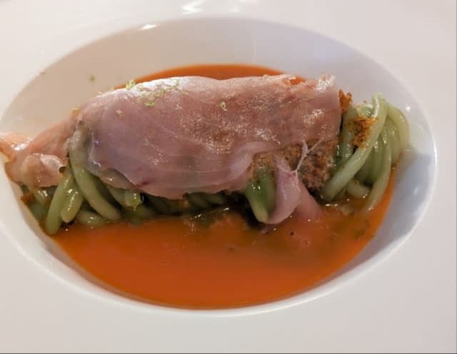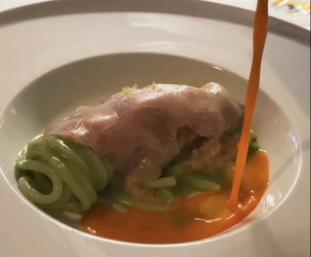 生ハムに包まれたピスタチオソースのパスタ。人参のフレッシュなジュースは眼の前で注がれる。