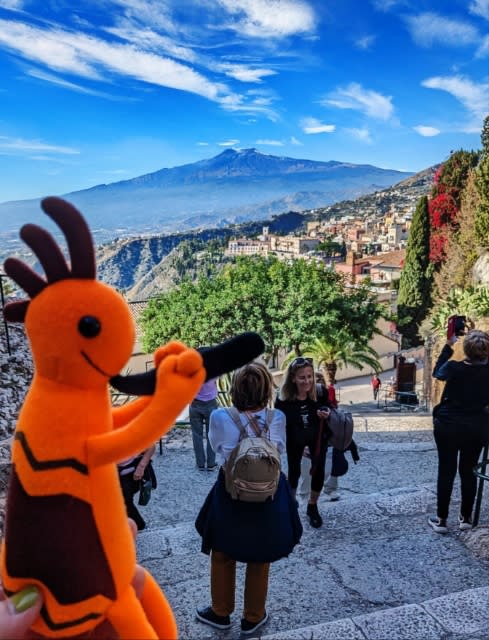 階段途中で振り返ると、それは正しく絶景の一言。見事なエトナ火山が出迎えてくれます。