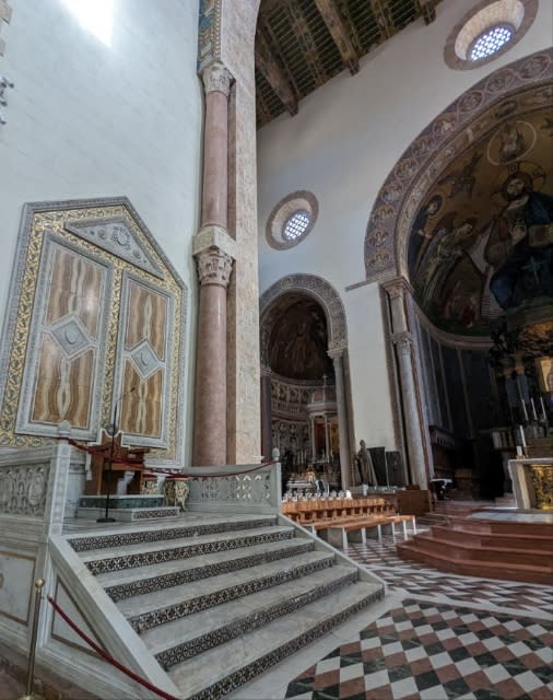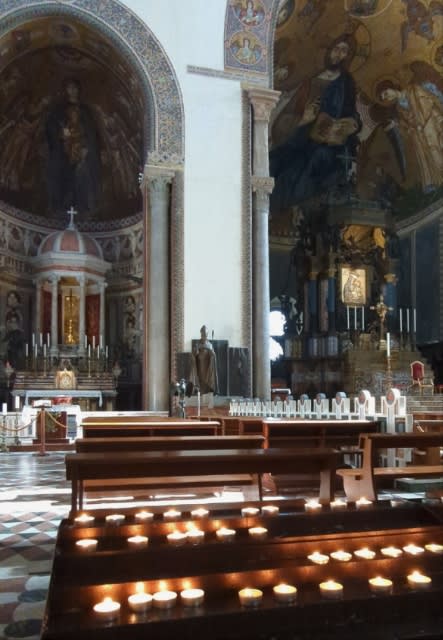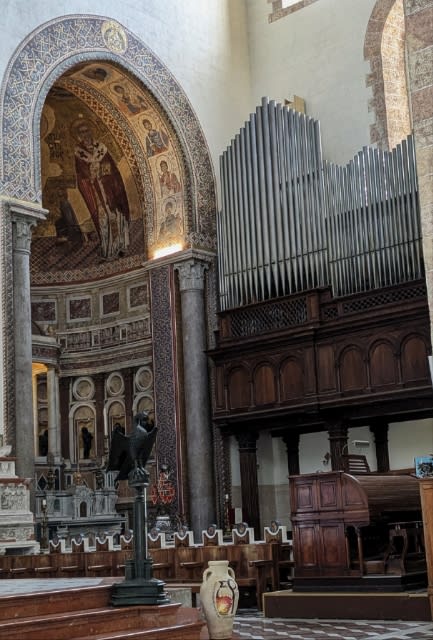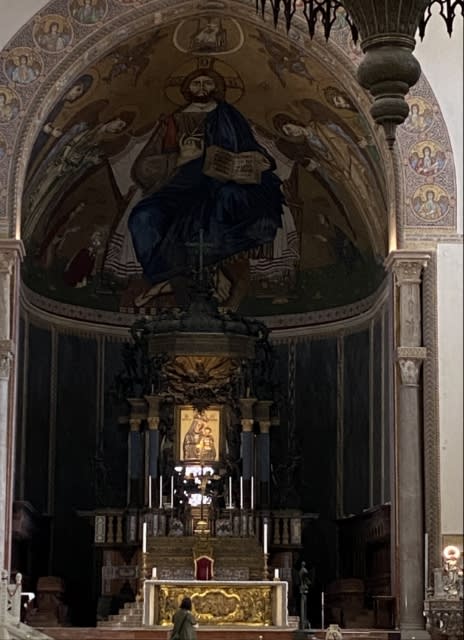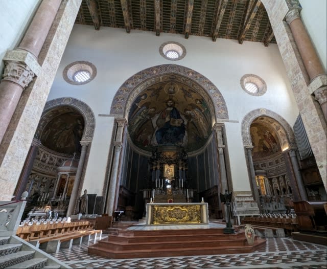 アプスの天井には14世紀の金地モザイクが再現されています。