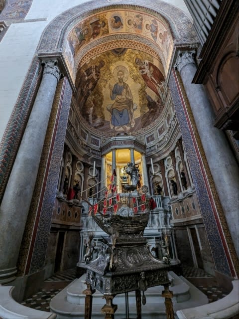 アーチ天井に描かれたモザイク画「万能のキリスト」はジュリオ・アリスティーデ・サルトリオというローマ人によって再現されました。