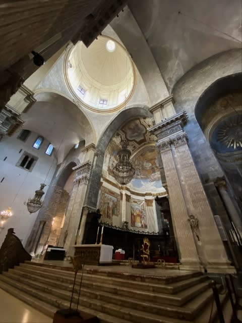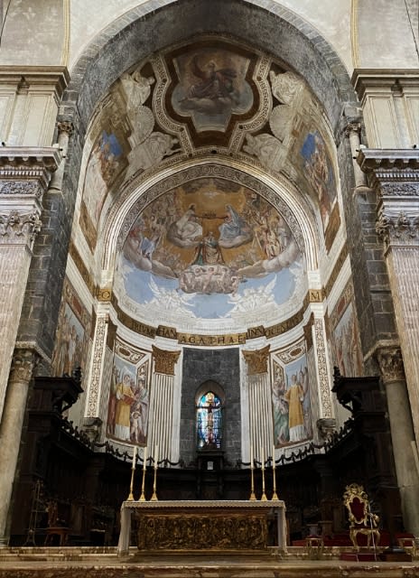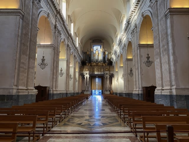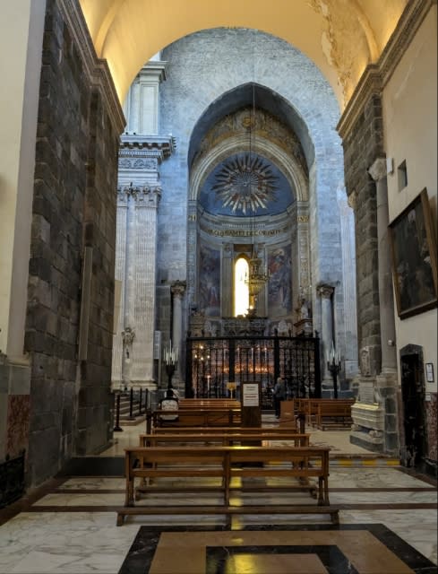 実は地震により倒壊。何度も建て直されたんですがその時、足りない材料を補うためエトナ山の灰や溶岩石を利用したそうです。