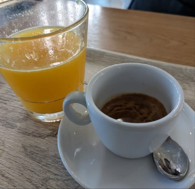 何の気無しにオーダーしたオレンジジュースがフレッシュで美味しい。◀5€