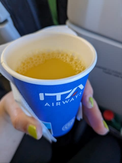 思いを馳せていると、ドリンクサービスが。オレンジジュースをチョイス。