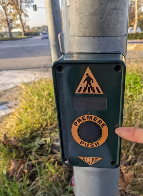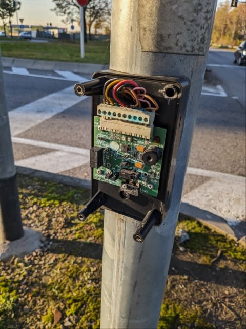 歩道に付けられた横断のためのボタンは無惨な姿……。