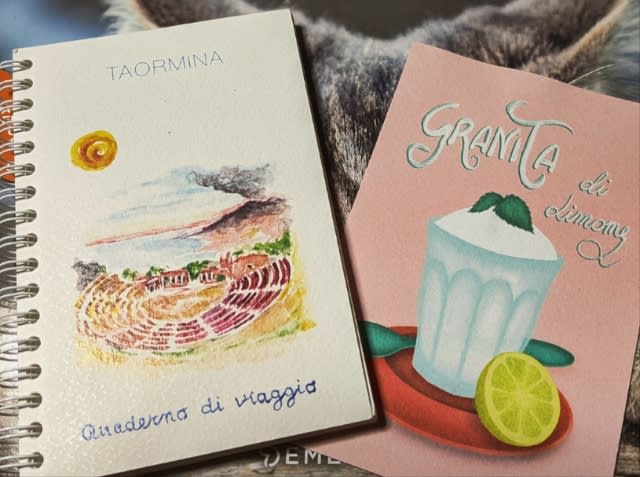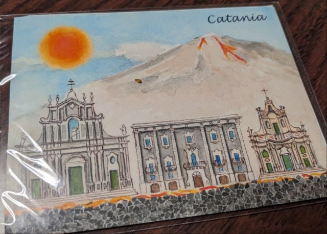 エトナ山とカターニアの町並みが描かれた折りたたみ式の飾り絵。